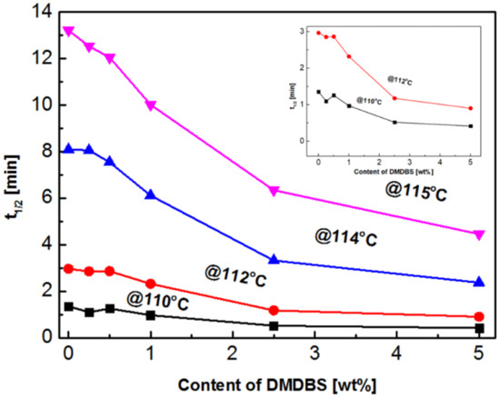 Changes of the crystallization half-time, t1/2, as a function of the DMDBS content for OBC/DMDBS composites at different isothermal crystallization temperatures. Note: Inset is a separate image of t1/2 as a function of DMDBS content.