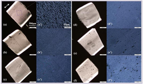 Representative POM images for OBC/DMDBS mini-injection molded samples with different contents of DMDBS. (a) OBC; (b) D0.25; (c) D0.5; (d) D1; (e) D2.5; (f) D5.