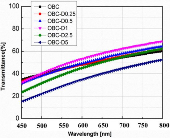By adding a small amount of DMDBS, the transparency of the composites could be significantly affected. In general, decreased crystal size is favorable for enhancing optical transparency [39]. The optical properties of OBC composites with different content of DMDBS are compared in Figure 7. For the OBC/DMDBS system, the optical transparency of pure OBC was as good as ~30%. When the content of DMDBS was less than 1 wt %, the transparency of OBC/DMDBS composite was equal to that of pure OBC. With the increase of DMDBS content, the transparency of the composite gradually increased. However, when the content of DMDBS was higher than 1 wt %, the transparency of the sample decreased with the increase of DMDBS content. OBC-D5 showed a seriously decreased optical transparency. POM images have proven that DMDBS has a limited miscibility with OBC. When DMDBS content was larger than 1 wt %, DMDBS started to form aggregates and their size can even reach ~10μm. This was consistent with the optical properties of OBC/DMDBS samples. It can be concluded that a low addition of DMDBS (less than 1 wt %) acted as effective nucleation sites and greatly decreased the crystal size of OBC, which can strongly increase transparency, while microscale DMDBS aggregates induced by high additions of DMDBS caused deterioration of optical transparency.