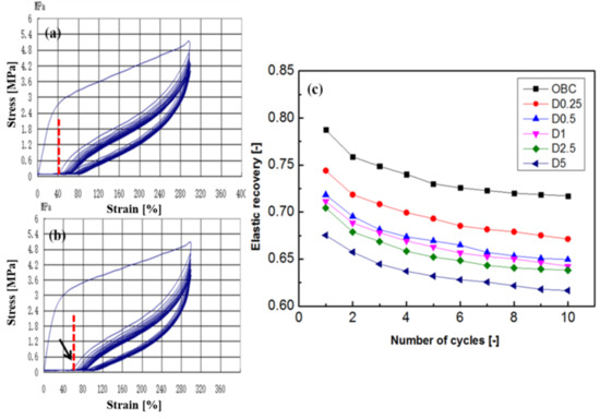 Furthermore, the effect of DMDBS on the mechanical properties of OBC was also evaluated. The cyclic tensile properties of OBC/DMDBS composites are shown in Figure 8. During cyclic tensile deformation of pure OBC samples, the loading-unloading curve shows good elastomeric behavior of OBC/DMDBS samples. After adding DMDBS, the yielding stress increased from 2.7 MPa to 3.1 MPa. At the same time, the tensile stress of the sample decreased gradually with the increase of the number of tensile cycles, showing the phenomenon of stress softening, which is similar to the Mullins effect [39]. Most of the mechanical hysteresis and stress softening occurred in the first cycle of multiple cycles. It could be seen that OBC-D5 has a larger residual strain (63%) than that of neat OBC (42%), indicating that the introduction of DMDBS is unfavorable for elastic recovery. For detailed comparison, elastic recovery (ER) of these OBC samples was quantitatively evaluated by using the following equation [39]:
