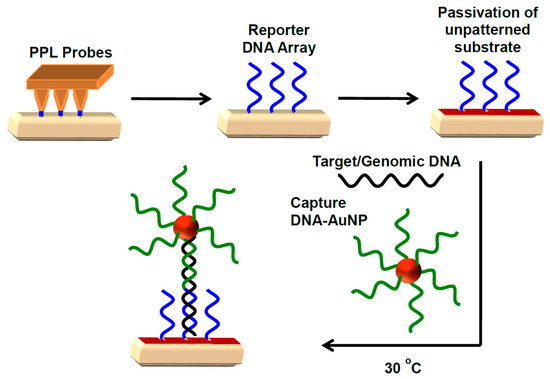 Schematic diagram illustrating the immobilisation of reporter DNA using polymer pen lithography (PPL) probes on a Au surface followed by the passivation of unpatterned substrate with triethylene glycol mono-11-mercaptoundecyl ether. In the presence of capture DNA-AuNPs, the target DNA forms a sandwich assay that can be detected optically.