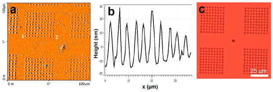 Next ink 2 was tested, which consisted of a buffer with trehalose added as a wetting agent. In contrast to ink 1, spin coating of ink 2 gave a uniform spreading of the ink on to the probe arrays. Using this ink loading method, the subsequent PPL of a 2 × 2 grid matrix (each grid consisting 10 × 10 dots) was performed. AFM imaging post-lithography clearly displayed the desired patterning (Figure 2a,b), which could also be visualised by optical microscopy (Figure 2c). Under the lithography conditions used, the individual dots with a full width at half maximum of ~ 1.0 ± 0.2 µm were observed by AFM. In the negative control experiment, when the same lithography procedure was performed with the buffer mixture but with the DNA omitted, no features were observed by either AFM or light microscopy. The surface substrates were then washed with water and subsequent imaging showed that these features were no longer visible by optical microscopy. This suggests that features observed before washing are composed primarily of the trehalose and buffer salts along with reporter DNA, which upon washing removed these excess ink components, leaving the monolayer of thiolated DNA on the surface. Notably, the features were also no longer observable post-washing even by AFM, which was attributed to both a decrease in feature height and increased roughness of the substrates post-washing.