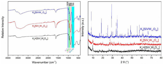 FTIR (left) and XRD (right) spectrum of the silicotungvanadium polyoxometalates.