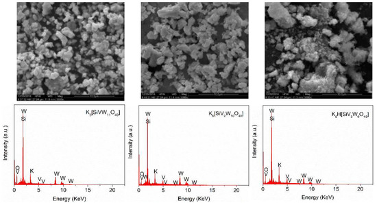 SEM micrographs (up) and EDX-spectrum (down) of the catalysts K5[SiVW11O40], K6[SiV2W10O40], and K6H[SiV3W9O40] from left to right respectively.