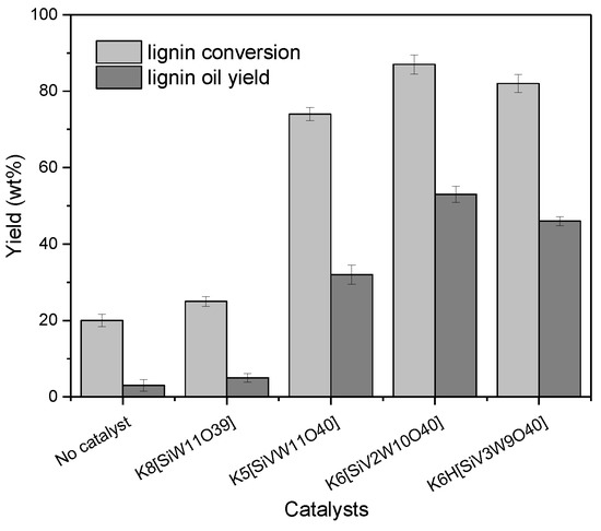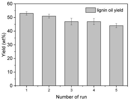 Reusability of the catalyst is one of the most important performance requirements in practical applications. During the lignin depolymerization process, the most important properties of POMs are their re-oxidation with oxygen, and the deoxidized POMs can be used for the next catalytic circulation. Considering the silicotungvanadium polyoxometalates are homogeneous catalysts, the aqueous phase of the product extraction step containing all the reacted catalysts was evaporated to dryness by water bath and was then subjected to next reaction. As shown in Figure 8, after five cycles under the optimizing conditions, the lignin oil yield had almost no significant changes with only 6% decrease. The results suggested the vanadium substituted silicotungstic polyoxometalates was stable under such conditions and could be reused without significant loss of its catalytic activity.