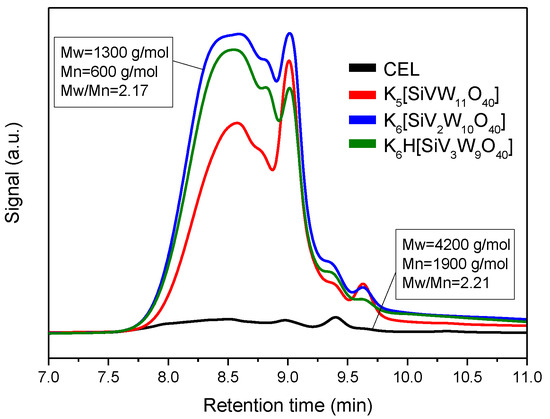 The catalytic efficiency of different vanadium substituted silicotungstic polyoxometalates were evaluated by the measurement of lignin conversion and lignin oil yield. As shown in Figure 4, the K6[SiV2W10O40] with two vanadium atoms exhibited both highest lignin conversion at 87% and lignin oil yield at 53%, respectively. As compared to the silicotungvanadium POMs, the control reaction without catalysts and with a vanadium-free POM K8[SiW11O39] showed both the low lignin conversion and lignin oil yield. This result reflected that the number of vanadium had significant effect on the catalytic transformation of lignin. The use of vanadium-substituted polyoxometalates with strong redox ability enhances the hydrogen liberation and the liberated hydrogen transfer to the reaction intermediates. As a consequence, the lignin conversion and products yields were enhanced. In general, the redox ability of POMs increases with the number of substitutions of vanadium, contributing to the increase of lignin conversion. During these reactions, K6[SiV2W10O40] performed higher efficiency than K5[SiVW11O40]. This may be attributed to the higher redox potential introduced by vanadium. However, the K6H[SiV3W9O40] with more vanadium atoms did not follow this rule. The possible explanation was that the lignin was over oxidized to carbon dioxide and water, and the lignin fragments were recombined during the reaction. The detail information about the oxidative reaction was characterized by GPC, HSQC and GC/MS as below.