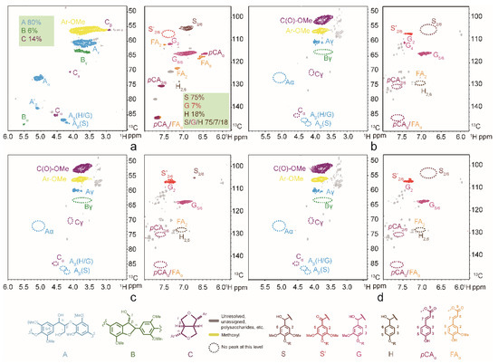 Expanded side-chain region and aromatic region of the two-dimensional heteronuclear single quantum coherence nuclear magnetic resonance spectra of cellulolytic enzyme lignin (CEL) (a) and lignin oily products (b) catalyzed by K5[SiVW11O40]; (c) catalyzed by K6[SiV2W10O40]; (d) catalyzed by K6H[SiV3W9O40]) after oxidative depolymerization reaction in DMSO-d6.