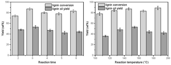 The effects of reaction conditions including reaction time and reaction temperature on lignin decomposition are shown in Figure 7. When the reaction time was prolonged from 2 h to 3 h, the lignin conversion yield and oily products yield changed from 74% and 48% to 87% and 53%, respectively. Prolong the reaction time to 6 h, the lignin conversion yield and oily products yield decreased to 83% and 44%, which was probably due to the slight repolymerization reactions of intermediate lignin fragments. These condensation reactions of lignin using POMs as catalysts have been well studied in previous reports [14]. A similar volcano-shaped trend was also observed at different reaction temperatures. Increase in the reaction temperature led to an increase of lignin conversion yield and oily products yield to 150 °C. When temperature was further increased to 190 °C, the lignin oily products yield was decreased from 52.7 wt % at 150 °C to 43.6 wt % at 190 °C. In brief, with the progress of the reaction, higher reaction temperature and longer reaction time would facilitate the depolymerization reaction, but the undesirable condensation reactions occurred in the final stage of reaction, thus inhibiting the efficient degradation of lignin.