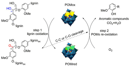 According to the chemical properties of the substrate, there are main three pathways during the oxidative reaction when using POMs as catalysts. Namely, electron-transfer, O-transfer, and radical-transfer [43]. Based on the above discussion on the products and structure changes before and after reaction, a mechanism is proposed for describing the lignin depolymerization over silicotungvanadium polyoxometalates. As shown in Figure 9, the POMs ions undergo repeated cycles of reduction and re-oxidation, which depends on whether the redox potential of POMs is high enough to oxidize the lignin substrate and low enough to be oxidized by oxygen [20,26]. At step 1, the POMs with a redox electrochemical potential oxidized the lignin substrate and the POMs was reduced. During the oxidation, the benzyl hydroxyl was selectively oxidized into the corresponding carbonyl, which could lower the bond energy of the C-O bond and make the β-O-4 linkages easier to fracture [2]. Chemoselective oxidation of the benzylic hydroxyl groups in lignin polymer is of great significance in the lignin oxidative depolymerization, and it represents an applicable way for facilitating the lignin depolymerization [44,45]. After the step 1, the insoluble macromolecular lignin turn into the soluble ligninox, then the ligninox undergo C–C and/or C–O cleavage, resulting in the forming of low molecular of aromatic compounds and partial oxidation of the lignin fragments to CO2 and H2O. Finally, the catalytic cycle is completed by the re-oxidation of POMred to POMox form using O2 (Step 2). The regenerated POMs could be reused in the next catalytic circulation.