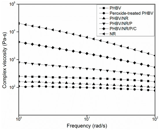 Complex viscosities of pristine PHBV, pristine NR, and PHBV/NR blends at 175 °C.