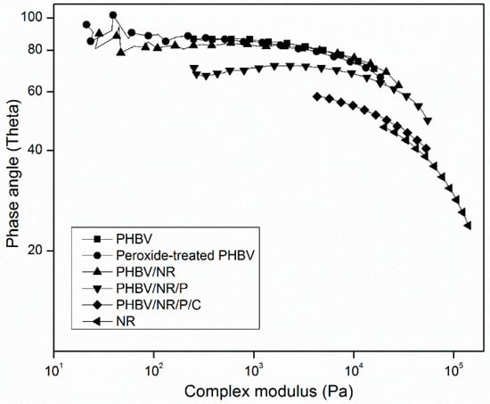 Van Gurp–Palmen plots of pristine PHBV, pristine NR, and PHBV/NR blends.