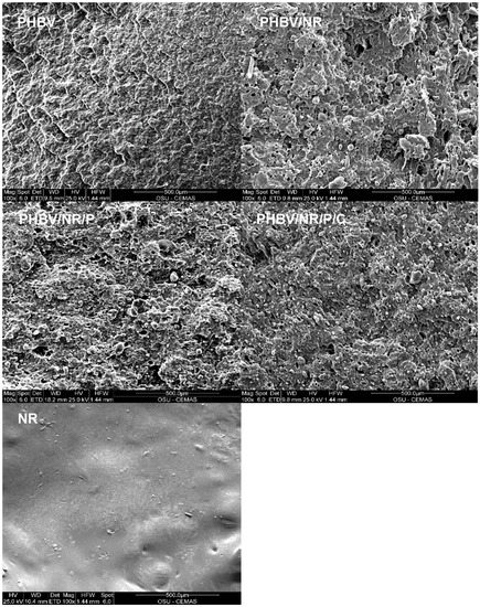 SEM images of the fracture surfaces of PHBV, NR, and the blends.