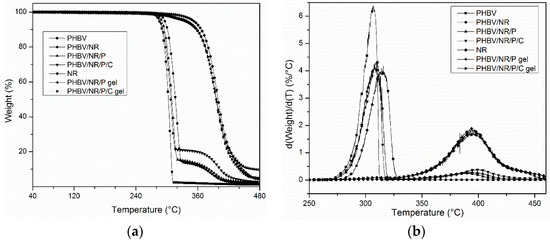 (a) Weight loss TGA thermograms; (b) Derivative weight loss TGA thermograms of pristine PHBV, pristine NR, blends of PHBV and NR, and the gels from PHBV/NR/P and PHBV/NR/P/C.
