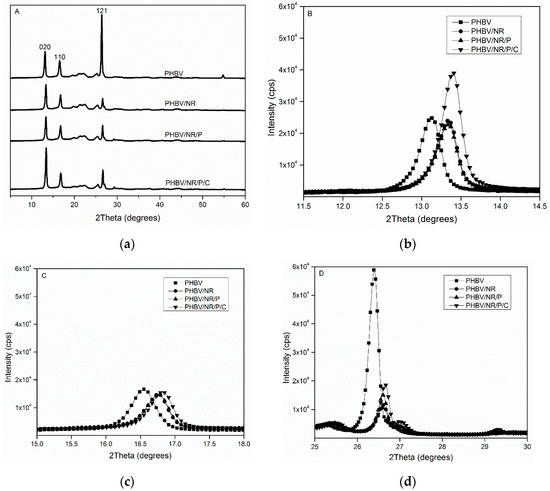 XRD patterns of pristine PHBV and the blends. (a) Overall XRD pattern from 2θ = 5° to 2θ = 60°; (b) XRD pattern of diffraction peak (020); (c) XRD pattern of diffraction peak (110); (d) XRD pattern of diffraction peak (121).
