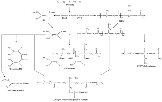 Possible reactions during melt blending of PHBV and NR in the presence of peroxide and coagent.