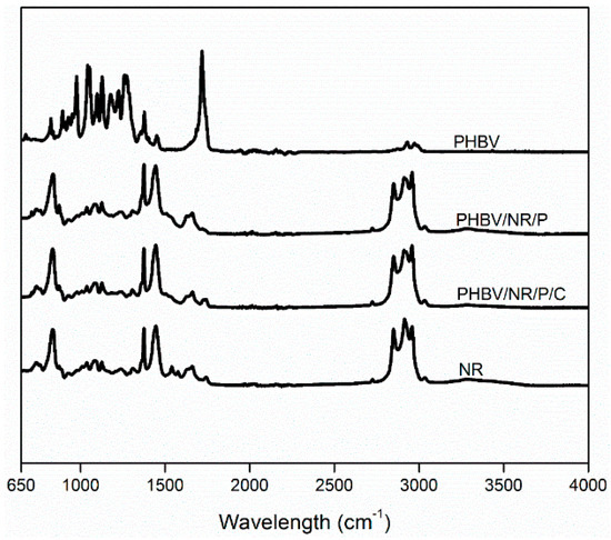 FTIR spectra of pristine PHBV, pristine NR, and gels from PHBV/NR/P and PHBV/NR/P/C blends obtained through chloroform extraction.