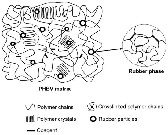 A conceptual structure of a coagent-assisted peroxide-cured PHBV/NR blend.