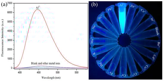 The sensing behavior of PEGBAB with different metal ions in pure aqueous solution was further studied by fluorescence measurements. As shown in Figure 1a, the aqueous solution of PEGBAB showed no distinguishable fluorescence response at 447 nm upon excitation at 367 nm. A remarkable enhancement of fluorescence intensity at 447 nm was observed after adding 2 equiv. of Al3+ to the PEGBAB solution. However, no obvious fluorescence changes were observed at 447 nm in the solutions of PEGBAB with 2 equiv. of other metal ions. The quantum yields of PEGBAB solutions with 2 equiv. of Al3+ was calculated to be 0.267 using quinine sulfate as the standard (ΦF = 0.546 in 0.5 M H2SO4 solution) []. Meanwhile, after adding Al3+ to the PEGBAB solution, the noticeable fluorescence change from non-fluorescence to strong bright cyan fluorescence could be observed immediately by naked eye under a 365 nm UV lamp (Figure 1b). The addition of other metal ions could not induce obvious fluorescence color changes of the solutions under a 365 nm UV lamp. The remarkable enhancement of the fluorescence emission intensity and the significant change of the fluorescence color of PEGBAB solution in the presence of Al3+ clearly indicates that PEGBAB is an efficient turn-on fluorescent chemosensor for the exclusive detection of Al3+ in 100% aqueous solution.