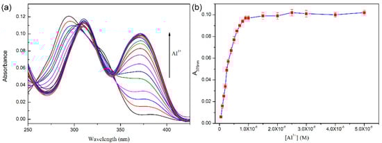 (a) UV-Vis absorption spectra of PEGBAB (10 μM) with the increasing concentration of Al3+ (0–50 μM) in aqueous solution. (b) Plot of absorption intensity at 370 nm against the concentration of Al3+.