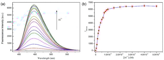 (a) Fluorescence spectra of PEGBAB (10 μM) with the increasing concentration of Al3+ (0–50 μM) in aqueous solution. (b) Plot of fluorescence intensity at 447 nm against the concentration of Al3+.