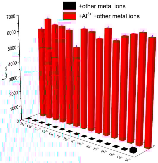 To explore the applicability of PEGBAB as a selective chemosensor for Al3+, competition experiments of PEGBAB to Al3+ were conducted in the presence of other competitive metal ions (Ba2+, Ce3+, Cd2+, Co2+, Cr3+, Cu2+, Fe3+, Hg2+, In3+, K+, Mn2+, Na+, Ni2+, Pb2+ and Zn2+). As shown in Figure 4, the fluorescence intensity of PEGBAB to Al3+ was not significantly influenced by coexisting competitive metal ions. It could be concluded that the existence of other metal ions did not influence the chelation of Al3+ with PEGBAB. Thus, PEGBAB can be employed as a highly selective fluorescent chemosensor for Al3+ over other competitive metal ions in pure aqueous solution.