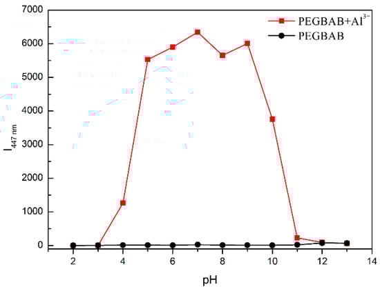 Generally, the pH value of the solutions could affect the sensing behavior of most fluorescent chemosensors in practical applications, and so the pH effect on the fluorescence responses of PEGBAB with and without the addition of Al3+ was investigated in aqueous solutions with pH values ranging from 2 to 13. As shown in Figure 5, the aqueous solutions of free PEGBAB showed negligible changes in the fluorescence intensity at 447 nm within the pH range of 2–13. However, after adding 2 equiv. of Al3+, different fluorescence responses of PEGBAB solutions were observed at a different pH range. Because the protonation of the Schiff-based group in PEGBAB inhibited the binding of Al3+ to PEGBAB at strong acidic conditions, the fluorescence intensity of the solution was quite weak when the pH was lower than 3. With the decrease of the acidity, the fluorescence intensity increased rapidly from pH 3 to 5. When the pH value was above 9, the fluorescence intensity of the solution went down dramatically due to the formation of Al(OH)3 or Al(OH)4− at strong alkaline conditions. Therefore, PEGBAB is an efficient turn-on fluorescent chemosensor for the detection Al3+ in the pH range from 5 to 10 and can be a suitable candidate for environmental and biological applications. Furthermore, a wide test temperature range is also important for practical applications. The detection stability of PEGBAB for Al3+ was studied in the temperature range of 20–80 °C. As shown in Figure S12, the fluorescence intensities of PEGBAB solutions upon the addition of 2 equiv. of Al3+ were quite stable within the temperature range of 20–80 °C, meaning that PEGBAB exhibited high sensing stability for Al3+ in the wide temperature range.