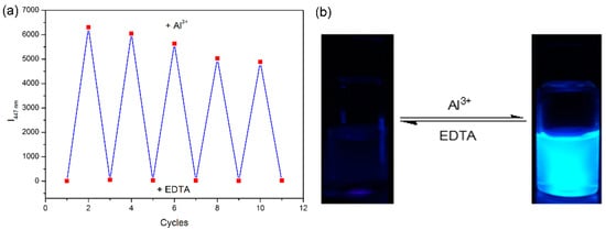 The reversibility of fluorescence response is one of the significant features of an excellent fluorescent chemosensor for practical application. The reversible binding of Al3+ to PEGBAB was investigated by fluorescence titration of PEGBAB solution upon the alternate addition of Al3+ and EDTA. As illustrated in Figure S13, after adding 1 equiv. of EDTA to the PEGBAB-Al3+ solution, the fluorescence of the solution was quenched and the fluorescent intensity at 447 nm returned to the initial intensity of free PEGBAB solution. After the addition of 1 equiv. of Al3+ again, the fluorescence of the solution was recovered. Furthermore, upon the alternate addition of Al3+ and EDTA into PEGBAB solution, the fluorescence switching response could be repeated for several cycles (Figure 6). The decrease of the fluorescence intensity might be caused by the excess EDTA that remained in the solution, which hindered the effective complexation of Al3+ with PEGBAB. These results suggest that PEGBAB can be used as a reversible fluorescent chemosensor for the detection of Al3+ in 100% aqueous solution.