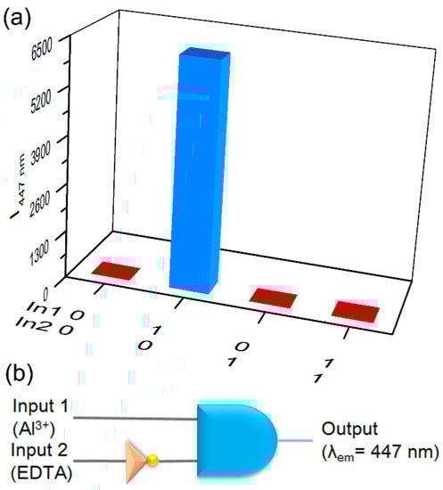 Since the seminal work about the two-input molecular logic gate reported by de Silva [], the construction of molecular logic gate based on fluorescent chemosensors has attracted significant interests [,,,,,]. Due to the fluorescence response of PEGBAB to Al3+ and EDTA, an INHIBIT type molecular logic gate could be constructed with Al3+ (In 1) and EDTA (In 2) as two chemical inputs and the fluorescence intensity at 447 nm as output. The presence of Al3+ and EDTA was defined as “1”, and the absence of these inputs was defined as “0” (Table 2). For the output, turn-on and turn-off of the fluorescence were defined as “0” and “1”, respectively. As shown in Figure 7a, only when the individual input of Al3+ was present, output “1” was obtained because the PEGBAB solution showed a prominent turn-on fluorescence response at 447 nm. In other input combinations, the output signal was “0”, implying turn-off of the fluorescence. The corresponding circuit diagram for the INHIBIT logic gate is shown in Figure 7b.