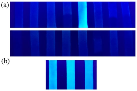 Test strip method has been proved to be an efficient strategy to evaluate the practical application of fluorescent chemosensors [,,]. The test strips coated with PEGBAB were prepared by immersing the filter papers into the methanol solution of PEGBAB and then drying in air. After being dipped in a 10−4 M aqueous solution of Al3+, the test strip exhibited strong bright cyan fluorescence under a 365 nm UV lamp, and the bright intensity of the test strips increased with the increasing concentrations of Al3+ (Figure S14). The test strips were utilized to recognize Al3+ over various metal ions and in different water environments. As shown in Figure 8a, when test strips were dipped into aqueous solutions of various metal ions, only the test strip with Al3+ showed a significant visible color change from non-fluorescence to strong bright cyan fluorescence under a 365 nm UV lamp. The competition experiments of test strips to Al3+ were also carried out in the presence of other competitive metal ions, and the bright fluorescence of the test strip to Al3+ was unaffected by other coexisting metal ions (Figure S15). Though PEGBAB in tap water and river water exhibited fluorescence emission compared with PEGBAB in deionized water, the fluorescence intensities were both very weak (Figure S16), which had no influence on the practical application of test strips. Upon dipping the test strips into different Al3+ solutions in deionized water, tap water and river water, all of these test strips exhibited distinct bright cyan fluorescence under a 365 nm UV lamp (Figure 8b). Furthermore, the temperature effect on the application of test strips was also investigated within the temperature range of 20–80 °C. As shown in Figure S17, the test strips all showed distinct bright cyan fluorescence from 20 °C to 80 °C under a 365 nm UV lamp. After being stored in air for 7 days, the test strip could still exhibit bright cyan fluorescence after being dipped into Al3+ solution (Figure S18), meaning that the prepared test strips were quite stable. Therefore, test strips coated with PEGBAB can be employed to on-site detect Al3+ in a real water environment.