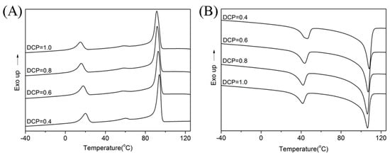Differential Scanning Calorimeter (DSC) curves of the EUG/LDPE blends with different dicumyl peroxide (DCP) dosage: (A) cooling curves and (B) heating curves.