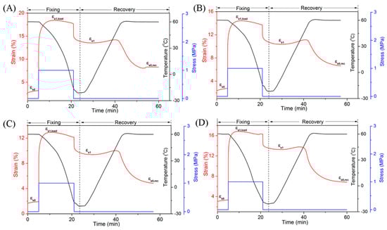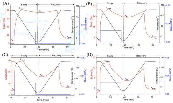 Dual Shape memory properties of the EUG/LDPE blends (Ttrans = 60 °C) with different DCP content: (A) 0.4 phr; (B) 0.6 phr; (C) 0.8 phr; (D) 1.0 phr.