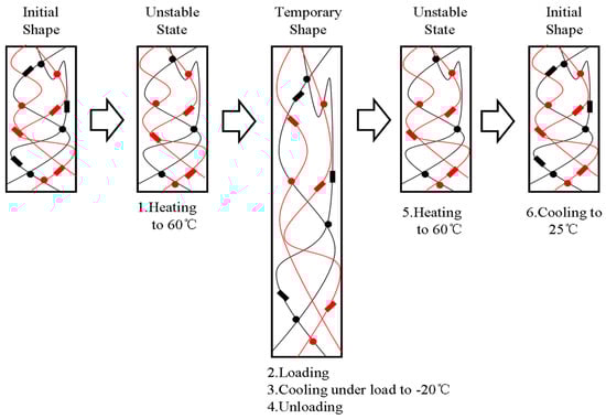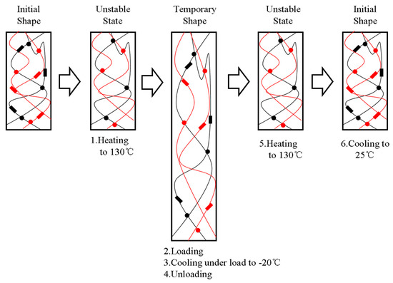 Generally, most SMPs are called dual SMPs because of their ability to change into two different shapes. The shape memory mechanism of SMPs can be illustrated as follows. First, the SMP specimen is deformed into a temporary shape above the transition temperature (Ttrans) under mechanical stress. The parameter Ttrans is vital for SMPs and usually refers to the glass transition temperature (Tg) for amorphous polymers and the melting temperature (Tm) for crystalline polymers []. Second, when the temperature is cooled to Ttrans, the temporary shape of the specimen is kept under the mechanical stress and fixed after removal of the stress. Finally, the permanent shape of the specimen is recovered by reheating the specimen above Ttrans, which is derived from the entropic elasticity stored in the samples in the stretch process. The shape memory behavior is imparted by two components of the SMPs: the first component is the fixed domain used for sustaining the permanent shape, which might consist of physically or chemically cross-linked points []. The second component is the reversible domain used for obtaining the temporary shape, which might consist of crystalline regions or soft segments of SMPs []. From a micro perspective, the fixed domain produces an elastic restoring force after material deformation, and the reversible domain freezes or unfreezes the temporary shape after material deformation by crystallization and melting transition.