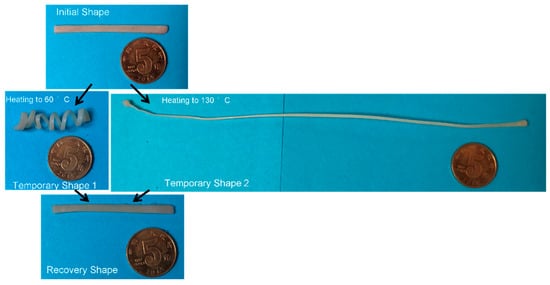 Similarly, a schematic diagram (Figure 5) was also proposed to illustrate qualitatively the shape memory mechanism of the EUG/LDPE blends in which only the cross-linked network acted as the fixed domain. The black lines represent the molecular chains of EUG, and the red lines represent the molecular chains of LDPE. Both the red and black rectangles represent the crystalline regions in the blends, and the dots with different colors represent the cross-linking points generated in the LDPE and EUG portions. When the samples were heated and kept isothermally at 130 °C, all crystalline regions melted. A temporary shape was formed and fixed when a mechanical stress was applied and the cooling process was preceded. After removing the stress and reheating again, the samples returned to their original shapes. We added digital images in Figure 6. In Figure 6, the sample was first heated to 60 °C, deformed by external stress, and given a temporary shape 1 after the cooling and fixing process. Similarly, the sample was given a temporary shape 2 at 130 °C. When the sample with a temporary shape was reheated again, the material returned to its original shape.