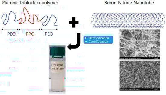 Boron nitride nanotubes were supplied from the High-Enthalpy Plasma Research Center at Chonbuk National University (Iksan, Republic of Korea). Anhydrous ethanol was purchased from Sigma-Aldrich (Seoul, Republic of Korea). The amphiphilic triblock copolymer Pluronic F127 was purchased from Sigma-Aldrich and Pluronic P85 was obtained from BASF. H2O was used as deionized water. D2O was purchased by Cambridge Isotope Laboratories, Inc. (Tewksbury, MA, USA).