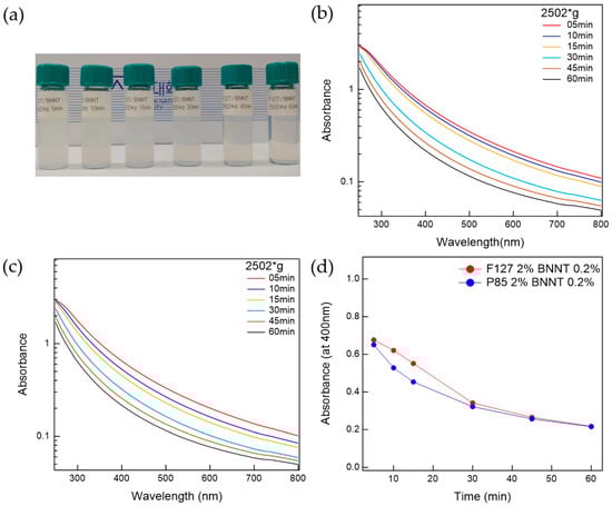 (a) Photo of F127-BNNT dispersions with different centrifuge times. UV–Vis measurements for (b) F127-BNNT and (c) P85-BNNT dispersion relative to centrifugation time. (d) Comparison between F127-BNNT and P85-BNNT dispersions’ absorbance at 400 nm versus centrifugation time.