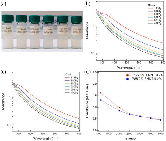 (a) Photo of F127-BNNT dispersions made at various g-forces. UV–Vis measurements for (b) F127-BNNT and (c) P85-BNNT dispersions depending on g-force. (d) Comparison between F127-BNNT and P85-BNNT dispersions’ absorbance at 400 nm versus g-force.