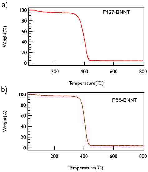 Both the prepared F127-BNNT and P85-BNNT dispersions were freeze-dried at −43 °C for 3 days to obtain a dry powder. TGA measurements were performed by TGA Q50 (TA Instruments, New Castle, DE, USA) The powders were heated from ambient temperature to 800 °C at a heating rate of 5 °C/min under N2.
