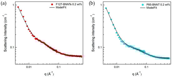 SANS intensities for (a) F127-BNNTs and (b) P85-BNNTs in D2O. The fitting model used is a sum model of the core-shell cylinder and Gaussian coil models.