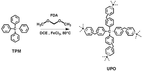 In our previous work, we reported on the synthesis and storage capacity of microporous solids with high surface area, belonging to the class of Hyper-Crosslinked Polymers (HCPs) [30]. In the following these solids are referred to as UPO (from University of Piemonte Orientale). UPO materials, prepared from tetraphenylmethane (TPM) and formaldehyde dimethyl acetal (FDA), represent a very attractive family of porous organic networks easily prepared by Friedel–Crafts reaction (Figure 1); in general, HCPs combine high gas uptake capacity, low synthetic costs, and easy industrial scalability [58,59,60,61,62,63].