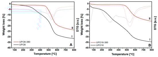 TGA analysis of UPO materials before (I) and after (II) thermal treatment at 380 °C for UPO8 (frame (A)) and UPO16 (frame (B)). The DTG derivatives are also reported (dashed curves). The analyses are performed under Ar flow (20 mL/min) using a heating ramp of 2 °C/min.