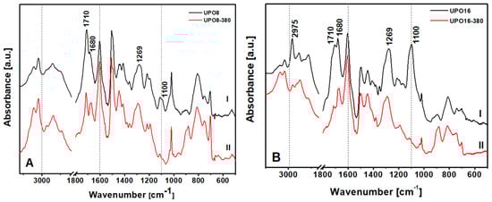 FTIR spectra in the region 3100–600 cm−1 of (A) UPO8 and (B) UPO16—samples before (I) and after (II) the thermal treatment at 380 °C.
