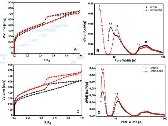 N2 adsorption-desorption isotherms at 77 K and pore size distributions of UPO polymers before (black circles) and after thermal treatment at 380 °C (red triangles): (A) UPO8 and UPO8-380 isotherms; (B) UPO8 and UPO8-380 PSD; (C) UPO16 and UPO16-380 isotherms; (D) UPO16 and UPO16-380 PSD.