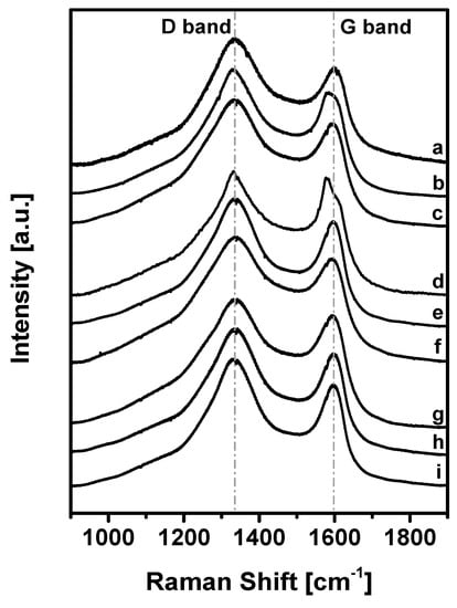 The spectra show two main vibrational bands at 1340 and 1600 cm−1: the latter (G peak) corresponds to the Raman-allowed E2g mode in the ideal graphite, while the signal at 1340 cm−1 (D peak) corresponds to the disorder-induced band, which is associated with the large density of phonon states [66].