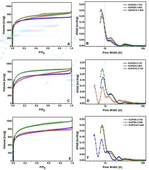 The PSD and the pore volume were evaluated for KUPO materials with N2 physisorption at 77 K. The adsorption isotherms and the related pore size distributions are reported in Figure 7. The structural data were obtained from the adsorption branches by applying the QSDFT method, parameterized for carbon surfaces and slit/cylindrical pores (Table 3) [68].
