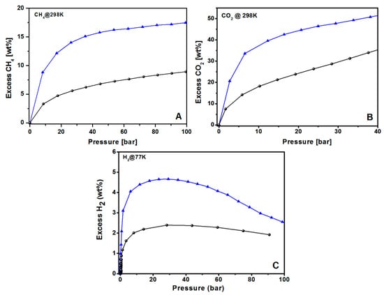 Gravimetric excess adsorption isotherms of UPO16 (black circles) and KUPO16-2-750 (blue triangles) for (A) methane (298 K, up to 100 bar), (B) carbon dioxide (298 K, up to 40 bar), and (C) hydrogen (77 K, up to 100 bar).