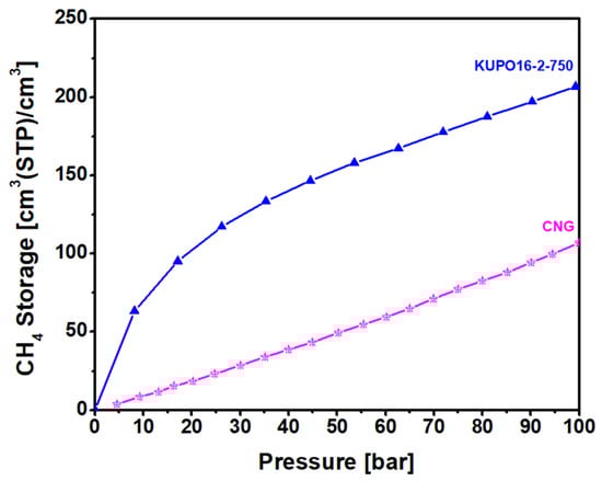 Methane storage capacity at 298 K of KUPO16-2-750 (blue triangles) compared to compressed methane gas (CG, pink stars).