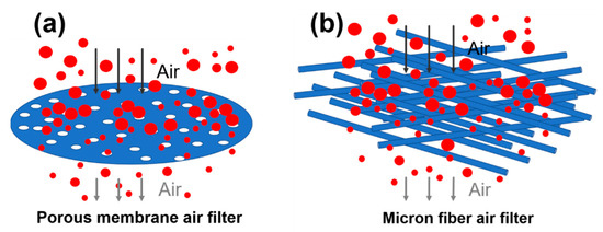 Comparison among different air filters. (a) Filter principle diagram of porous membrane air filter; (b) filter principle diagram of micron fiber air filter.