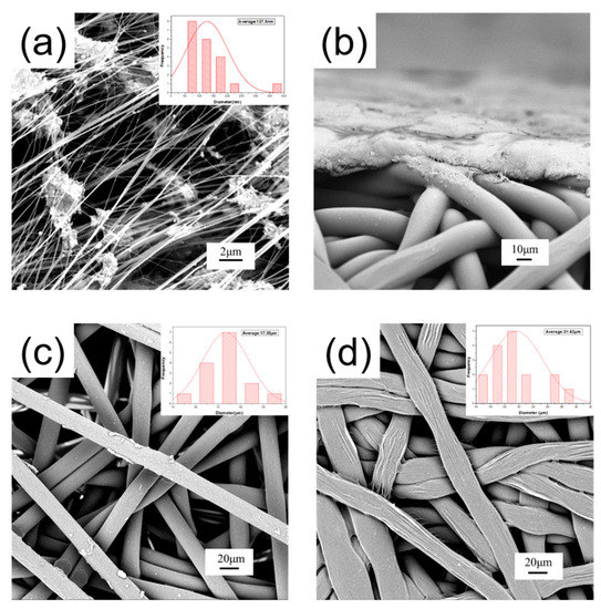Figure 3 shows the SEM image of the surface and substrate of the composite PTFE fiber membranes, along with its cross section (Figure 3b). From the SEM image of the sample, it can be seen that the average diameter of the fiber on the surface of the composite plastic filter membranes is 127.5 nm (Figure 3a). Figure 3b show the SEM image of the CPFMs cross section at a magnification of 1500×. It is evident from the cross-sectional SEM image of the sample that the CPFMs are compounded by two layers of fiber membranes. Figure 3c,d show the SEM image of the substrate at a magnification of 1000×, which is including hot pressing structure (Figure 3c) and no hot-pressing structure (Figure 3d). By comparing and measuring the fiber diameters before and after the hot pressing, it can be clearly seen that the fiber diameter after hot pressing increases, and the bonding between the fibers is better. The average fiber diameter of the hot-pressed part of the substrate is 17.35 μm (Figure 3c), and the fiber diameter increases to 21.62 μm (Figure 3d) after hot pressing.