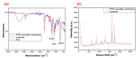 Composition comparison of PTFE nanofiber membrane and substrate. (a) Infrared spectroscopy image; (b) Raman spectroscopy image.