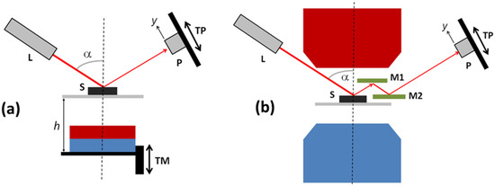 The spread optical reflectance setup (a) with a permanent magnet and (b) with an electromagnet: The red and blue elements indicate the north and south poles of the magnet, respectively. The other elements are L, laser; S, sample; P, photodiode; TM, translation stage for a magnet; TP, translation stage for a photodiode; and M1 and M2, mirrors.